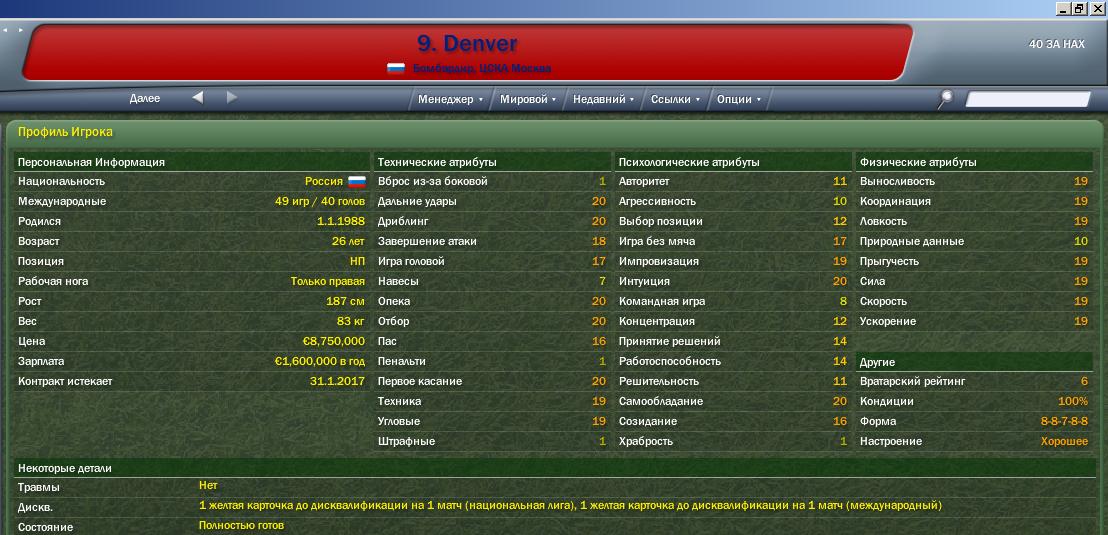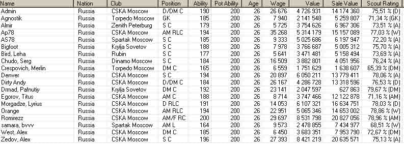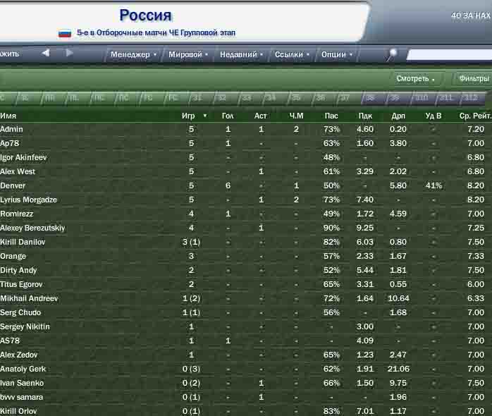 В самом начале сезона АС78 по окончанию контракта отказался его подписывать, после Романцева всё равно остались от клуба одни руины, и уехал в Спартак, где теперь заправляет Оборин. Больше переходов в начале сезона не было. Суперкубок ЦСКА выиграли у Динамо 1-0. в кубке страны ЦСКА встречался с Амкаром 2-0. Лига чемпионов. Тут красота. 1/8 – ЦСКА София – 2-2 и 2-0 1/4 – Вердер Бремен – 3-1 и 4-1 1/2 – Бенфика – 2-0 и 1-1 Финал – Бавария 1-0. как вы понимаете, ЦСКА взяли Лигу Чемпионов. Но не все наши играли в финале. Этого высокого звания удостоились Админ, Энди, Ап78, Титус Егоров, Оранж, Ромирез, Алекс Вест и Алекс Зедов. Лириус был травмирован и не играл. Алекс Зедов и Энди попали в сборную года ЛЧ, а Зедов с 10-ю мячами стал лучшим бомбардиром ЛЧ. Что там в сезоне произошло. Крылья советов и Сатурн вылетают из высшей лиги. Утопил Романцев отличный клуб. Эх. Вместе с ним на дно пошёл и БигФут, хотя провёл очень даже неплохой сезон. Пафнутий играл не шатко, не валко – как обычно, в общем-то. У него истекает контракт по окончании этого сезона, и он его продолжать не собирается. Всё идёт к тому, что следующий сезон Дрмад начнёт в другом клубе. В каком –пока неизвестно. Зенит – 13-е место. Альмир на пару с Михаилом козловым (тоже читером) – лучшие бомбардиры клуба. Давно Альмир не играл весь сезон – после Тульского Арсенала аж – семь лет кис он в ЦСКА, а тут оттянулся. Сыграл в целом неплохо. Теперь чувствует, что перерос этот клуб и хочет уйти. Рубин – 11-е место. Лёха Бёрд второй год в высшей лиге, и на этот раз серъёзно прибавил в игре. Молодец! Торпедо – шестое место. Ангостик сыграл не так ярко, как в прошлом сезоне. А Мерлин наоборот, немного прибавил. Но в целом оба сыграли ниже своих возможностей. АС78 в Спартаке – просто суперзвезда! Если бы не уход Денвера оттуда – эта пара бы могла горы свернуть. Но не судьба! Денвер в середине сезона вдруг собрал вещи и уехал в ЦСКА. Тем не менее, АС78 проводит своё лучший сезон в карьере, кстати, как и БВВ. Но, к сожалению, их усилий хватило только на четвёртое место. Динамо. Чудо продолжает в одиночку преданно тянуть Динамо наверх. Третье место. Чудо вернулся в основу, после того, как Кобелева выгнали и пришёл некий Магомаев, и клуб снова попёр вверх. Сыграл почти как в лучшие свои сезоны, хотя, конечно, до уровня АС78 и Алекса Зедова он похоже никогда не дотянется. Второе место – Висложопкинское Торпедо-ЗИЛ. Браво! Полюбил он Торпедо-ЗИЛ и прописал его в фаворитах. ЦСКА. В нападении по-прежнему заправляет Зедов и Божинов, Ромирезу нашлось место в составе под нападающими. Денвер пока в основу пробивается с трудом, находится на ротации, но пока счастлив. Энди – лучший в кулбе после Березуцкого и проводит свой лучший сезон! Остальные все как обычно. Титус – худший Вообще, игроки ЦСКА имеют дружно очень высокие рейтинги, потому что ЦСКА играл хорошо как никогда. Лучшим игроком года стал тем не менее Павел Погребняк из Томи, которая заняла пятое место. Второй – Сычёв, наших нет. Лучший бомбардир – АС78 – 19 мячей (пятый раз за 6 лет, уступил один раз в прошлом году Денверу). Второй – Божинов – на мяч меньше. В сборной года – только Админ. Всё. Российская Сборная. Как и ожидалось, россияне не пробились на чемпионат мира, и стартовали в отборочных играх на Европу. Уверенно идут на пятом месте после пяти игр, пропустив вперёд себя таких грандов как Германия, 