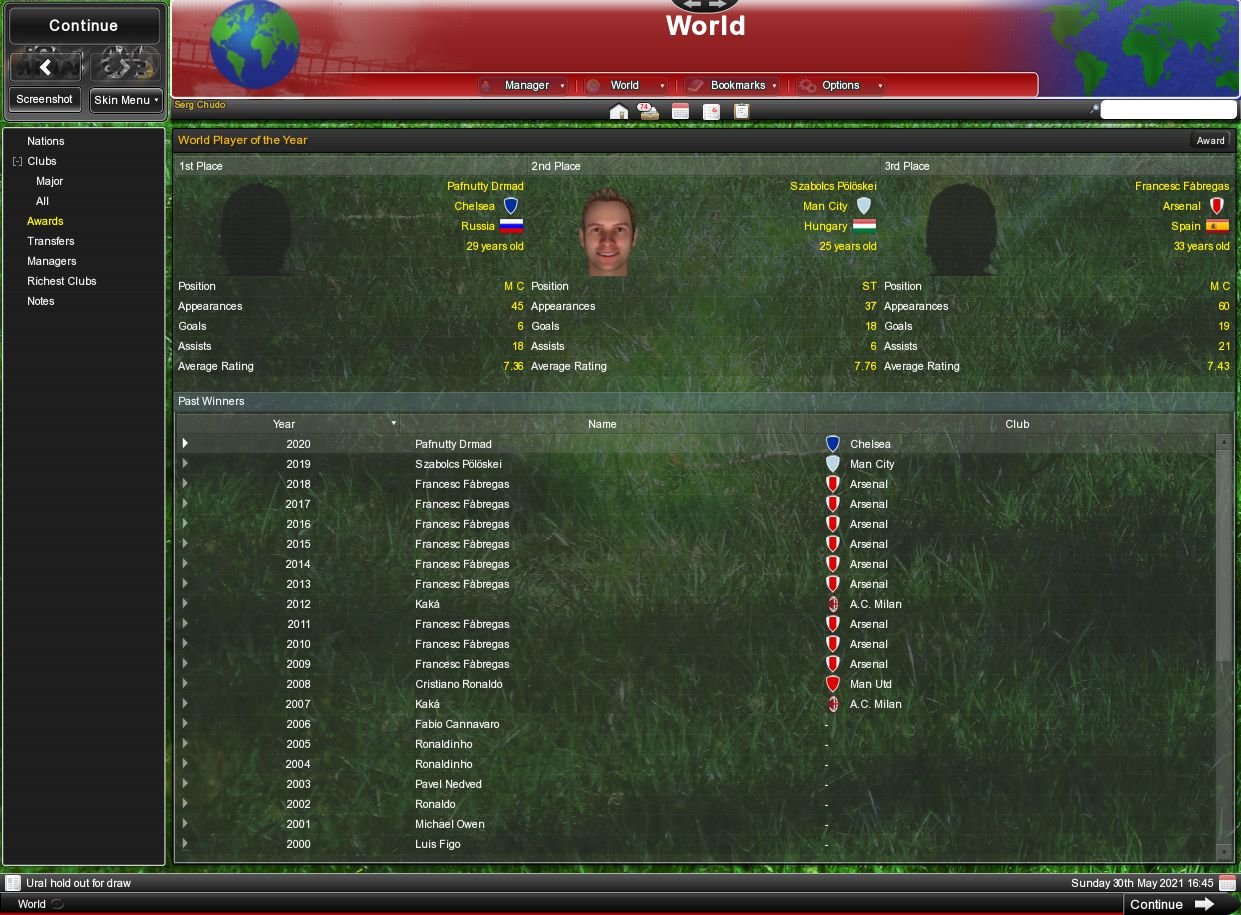 В Челси одиноко пасётся Пафнутий. Как показало голосование - он у нас щас один из лучших. Сезон провёл на обычном своём уровне, чуть хуже, чем предыдущий. В клубе по игре в тройке лучших. Однако клубу это помогло мало. В чемпионате Челси занял шестое место, в финале кубка Англии ФА уступил фаворитам Арсеналу 0-2. В кубке УЕФА легко вышли из группы, весной сначала прошли Черноморец 3-1 и 3-0, а затем уступили в 1/8 Байеру 0-1 и 1-3. В общем-то, опозорились везде где можно. Зато, внимание. Пафнутий в Англии назван игроком года. В России - игрок года. В Англии - в символической сборной. В МИРе -в символической сборной. И, наконец, признан лучшим игроком мира! УРА, товарищи! Эскизы прикрепленных изображений |