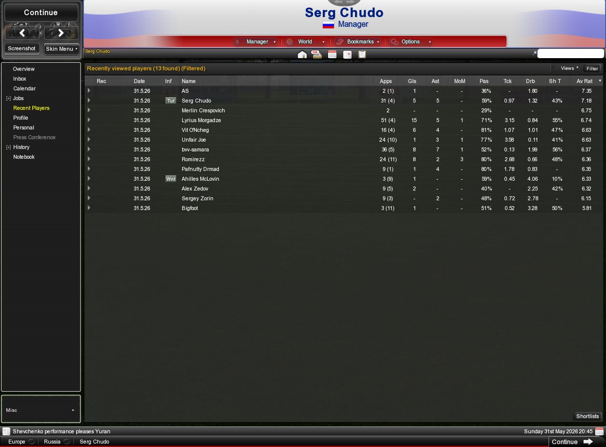 МанЮтд на этот раз занял третье место. Кстати, у руля по-прежнему сэр Алекс, в свои-то 84 года. Мерлин сыграл 2 матча, оба в основе, один в лиге (пропустил 2 мяча), другой в кубке, отстоял насухо. Щаслив. МанСити снова чемпион. Но в ЛЧ произошло фиаско. Уже в первом же весеннем туре проиграли Милану. Вся наша троица читеров как-то резко утратила в клубе лидирующие позиции, может, поэтому провал в ЛЧ? Пафнутий стал жёсткий лавочник, ОНчег сыграл лишь 16 матчей, и лишь Джо, сыграл 24 матча, впрочем, для него последние 4 сезона это обычная цифра. В общем, налицо спортивное увядание. Однако вся троица по прежнему входит в число лучших 11 игроков России, хотя других авардов уже не видно даж близко. |