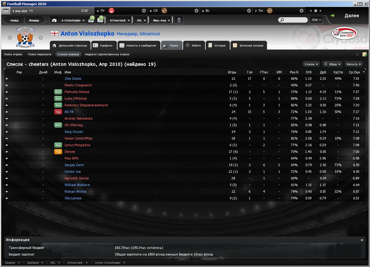 Промотал до января. Скоро у всех истекают аренды, а пока ситуация следующая. Чудо и АС-78 трудятся во всю. Чудо в основном играет левого защитника, АС-78 – нападающего. Совместными усилиями Сток Сити идёт на втором месте, что является выполнением задачи. Чудо 1 раз попал в сборную недели, а АС-78 один раз был признан молодым игроком месяца, и один раз забил гол месяца. Джо играл в Барнсли, который тоже успешно решает свою задачу находится в середине таблицы – 14е место. В основном играл защитника, один раз стал игроком недели. Зедов в Вигане лучший, а Виган его усилиями идёт на первом месте, опережая Стоксити на одно очко. 3 раза попал в сборную недели, и один раз был назвал игроком месяца. Ахиллес в Мидлсбро сезон проваливает, впрочем, как и весь клуб. Вместо ожидаемого первого места они плетутся на 17м. Ахиллес мало забивает, да и вообще один из худших игроков клуба. Зорин в Престоне, как и Джо в Барнсли, с задачей справляется. Клуб середняк – 15е место, у них всё нормально. Ноттингем свою задачу не выполняет – идёт на девятом месте, Волос в основе почти не играет, по игре – один из худших игроков клуба. Остальные игроки у нас не в аренде, и пытаются играть в основе своих клубов. Ща посмотрим, как это у них получается. Агностик в Чарльтоне основной и незаменимый, ну это и понятно. Чарльтон болтается в серединке. Астон Вилла с Денвером и Максом идут на 10м месте. Денвер играет и в еврокубках, и в чемпионате один из основных, даже один раз попал в сборную недели, а вот Макс, при тоже неплохой игре, в основу попадает намного реже, а в еврокубках так и вообще даже на замену не вышел ни разу. Астон Вилла прошла уверенно групповой турнир Лиги Европы и вышла на весну, где её ждёт Панатинаикос. Пафнутий в Атлетико тоже один из основных, к тому же ещё и играет очень качественно, да и в ЛЧ регулярно засвечивается. Правда, клуб из ЛЧ вылетел (уступил в группе Аяксу и Интеру), но зхато попал в Лигу Европы, где весной будет играть с Цюрихом. Пафнутием интересуется Тоттенхем в аренду с выкупом. Вован в Петерборо жжот. Лучший игрок клуба, тянет за собой клуб, но этого мало, так как остальные играют не особо, походу в вышку никому не надо – клуб идёт на 8м месте. В МЮ наших трое – Ромирез, ОМентал, Лириус. Никто из них особо не играет в чемпионате, где МЮ, к слову, идёт пока на первом месте. Но все зато периодически играют в Лиги Европы. Ромирез учится у Руни, Лириус – у Джонни Эванса, ОМентал – у бразильца Андерсона. Яковенко в Эвертоне пока тоже никак не пробьётся в основу. Клуб идёт на 15м месте. Мерлин в Барсе сидит в юниорах, пока обкатывают его так же как в прошлом году. Сидя на лавке в Суперкубке Европы, стал его обладателем. А вот на клубный чемп мира его не взяли. А жаль – Барса его легко выиграла. ОНчег в Ливерпуле так же не пробивается в основу. Играет в дубле. Им заинтересовался Монако (аренда с правом выкупа). Эскизы прикрепленных изображений |