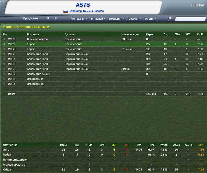 Терек – 13-е место. Ас78 играет по меньшей мере не плохо. А вот Вест что-то сбавил. Так или иначе, а коаанда играла плохо. В конце сезона Ас78 переходит в Крылья (заметьте, первый, кто переходит в клуб-фаворит!!!), и, я думаю, Терек на следующий год обречён. скрин даю Ас78, потому что из-за перехода его статистика исчезла из годовой.