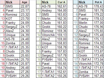 А вот средние возраст, текущие и потенциальные возможности комманд: