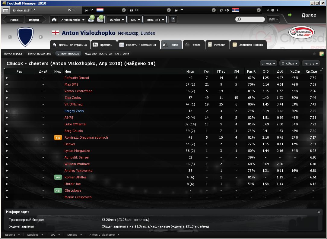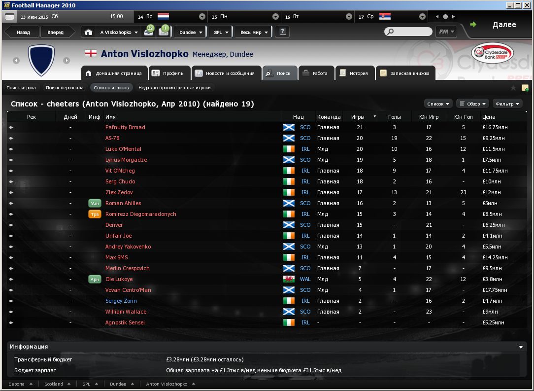 Зедова, так воспеваемого последнее время, и оцениваемого как самого талантливого среди всех прочих червяков, отдали в аренду в Виган, у которого задача – побороцца за выход в плей-офф из второй лиги. У Зедова там статус ключевого, и одновременно он самый дорогой игрок клуба. Ахиллес ушёл в Мидлсбро, статус основного. Клуб солидный. В прошлом году заняли втрое место, и в этом году у них цель – не просто запромоутится, но и выиграть вторую лигу. Чудо заарендован СтокСити. Статус – основной. Так же сток заарендовал АС-78, но статус ключевого игрока. В прошлом году клуб вылетел из вышки, и в этом у него цель если уж не выиграть лигу, то запромоутится надо полюбас. Да с такими двумя арендами если не выйдет – болельщики не простят. Джо уехал в аренду в Барнсли. Клуб средненький, задач никаких не решает, но Джо там канает за ключевого. Престон, тоже такой же середняк, как и Барнсли, арендовал Зорина, как основного. Ну и последняя аренда - Волос уехал в Ноттингем, как основной. Ноттингем будет пороца за промо-плей-офф. Вонан, вылетев из премьер-лиги, так никуда и не ушёл из клуба (напомню, Петерборо), клуб ставит перед собой задачу непременно вернутся в вышку. Вован на это купился, и решил больше не бузить, а засучив рукава, пахать. Денвер, наш горемыка, таки устроил свою судьбу, его купила Астон Вилла, у которой задачи попасть в еврокубки. Статус – ротация. Как мы помним, в Астон Вилле у нас обитает СМС, который тоже на ротации. У остальных – без перемен на 1 сентября. |