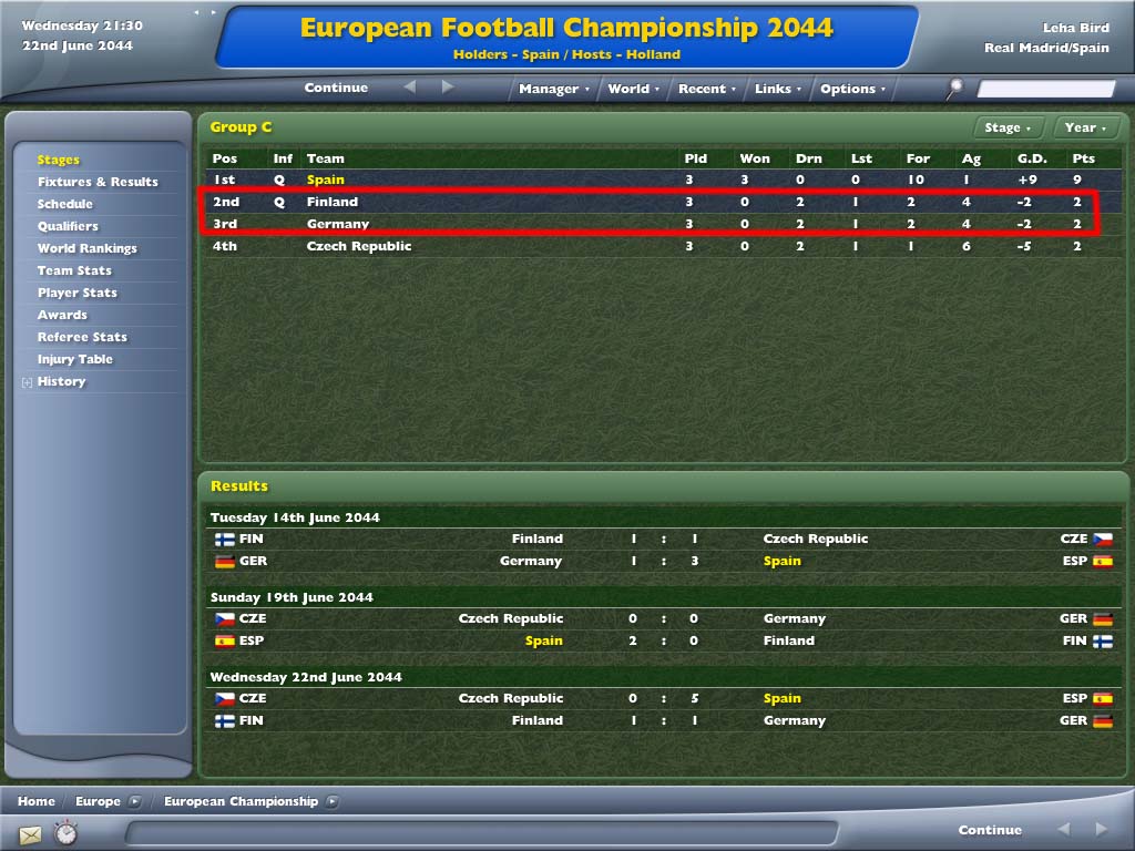 Вопрос - почему дальше пошла Финляндия, а не Германия? (Вариант ответа - по алфавиту В ирл вроде они должны были доп время играть... Элементарно - три команды по 2 очка, в играх между собой у Финляндии разница 2:2, а у чехов и немцев 1:1... по большему количеству забитых голов между собой -------------------- |