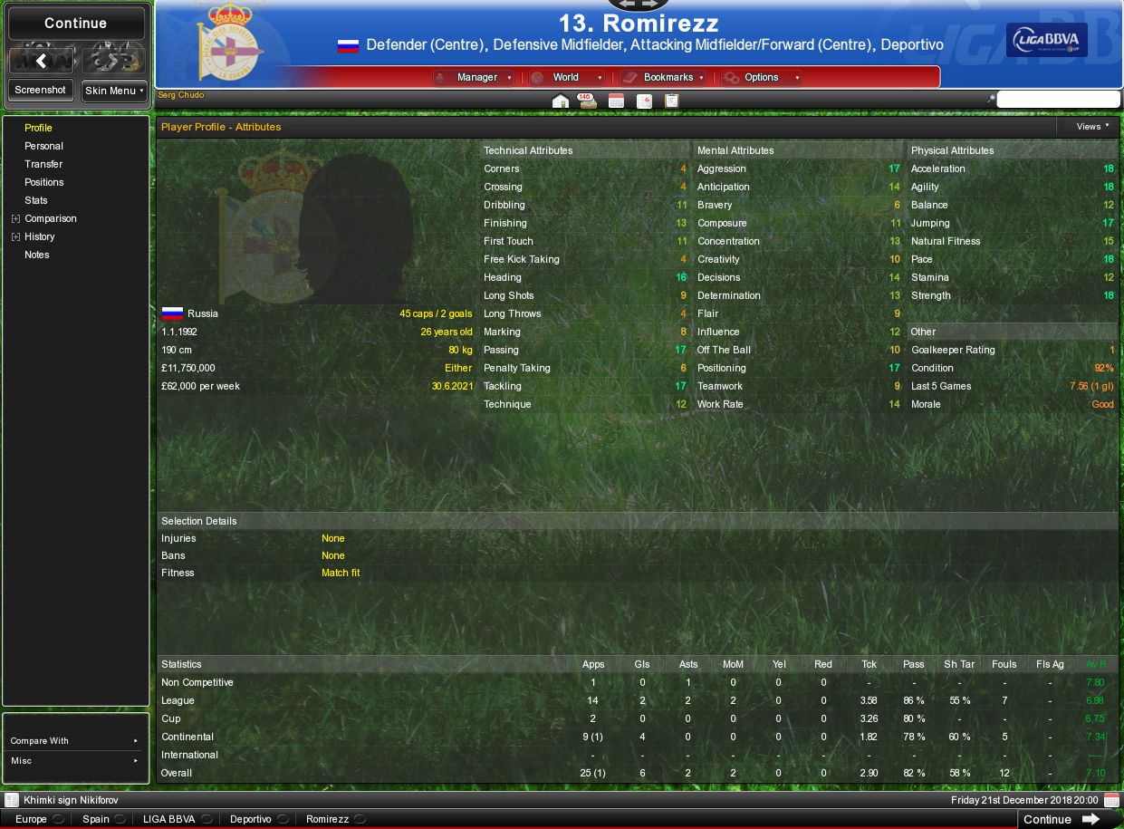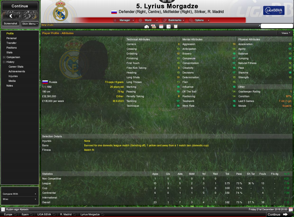 Реал пока идёт на втором месте, уступает Виллареалю 3 очка. Клубного чемпионата мира у Реала в этот раз нет. ЛЧ-то не взяли. В ЛЧ Реал занял первое место в группе с Аяксом, Вердером и Чатеруа. Играет Лириус на своём обычном уровне, по качеству игры в клубе спустился ниже, седьмой. Эскизы прикрепленных изображений |