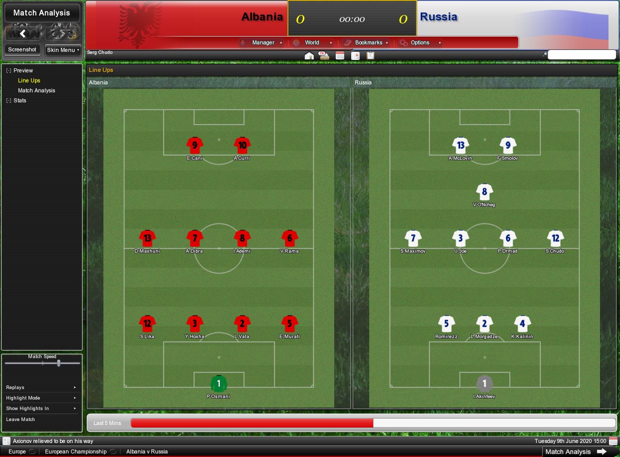 Начну по-порядку, то есть со сборной, что она делала целый год в товах перед чемпионатом Европы. Южная Корея 5-1. Голы - Чудо, Зедов-2, ОНчег и Биля. МОМ- Пафнутий. Хорватия 2-2. Дубль Зедов, он же МОМ. Если так пойдёт - Зедов успеет меня по голам в сборной обогнать. Гонконг - 10-0! Дубли - ОНчег, Чудо, Медведев, по голу - Максимов, Калинин, Вхиллес, Зедов. Больше всех ассистов у Пафнутия - 3. МОМ - Медведев. И последний контрольный матч с Испанией. 0-2. Как посильнее соперник - и пизда сразу. Правда, нужно отдать должное - у наших весь матч было подавляющее преимущество. На ЧЕ мы попали в группу Албания, Испания, Румыния. Честно говоря, я вообще в шоке, что тут есть Албания. |