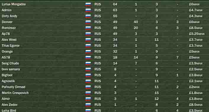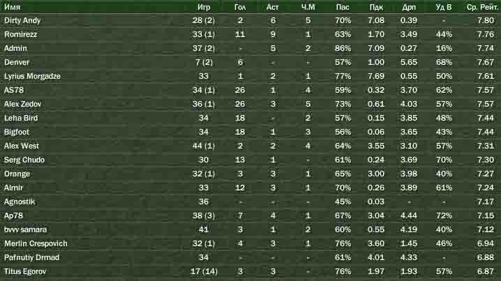 В самом начале сезона АС78 по окончанию контракта отказался его подписывать, после Романцева всё равно остались от клуба одни руины, и уехал в Спартак, где теперь заправляет Оборин. Больше переходов в начале сезона не было. Суперкубок ЦСКА выиграли у Динамо 1-0. в кубке страны ЦСКА встречался с Амкаром 2-0. Лига чемпионов. Тут красота. 1/8 – ЦСКА София – 2-2 и 2-0 1/4 – Вердер Бремен – 3-1 и 4-1 1/2 – Бенфика – 2-0 и 1-1 Финал – Бавария 1-0. как вы понимаете, ЦСКА взяли Лигу Чемпионов. Но не все наши играли в финале. Этого высокого звания удостоились Админ, Энди, Ап78, Титус Егоров, Оранж, Ромирез, Алекс Вест и Алекс Зедов. Лириус был травмирован и не играл. Алекс Зедов и Энди попали в сборную года ЛЧ, а Зедов с 10-ю мячами стал лучшим бомбардиром ЛЧ. Что там в сезоне произошло. Крылья советов и Сатурн вылетают из высшей лиги. Утопил Романцев отличный клуб. Эх. Вместе с ним на дно пошёл и БигФут, хотя провёл очень даже неплохой сезон. Пафнутий играл не шатко, не валко – как обычно, в общем-то. У него истекает контракт по окончании этого сезона, и он его продолжать не собирается. Всё идёт к тому, что следующий сезон Дрмад начнёт в другом клубе. В каком –пока неизвестно. Зенит – 13-е место. Альмир на пару с Михаилом козловым (тоже читером) – лучшие бомбардиры клуба. Давно Альмир не играл весь сезон – после Тульского Арсенала аж – семь лет кис он в ЦСКА, а тут оттянулся. Сыграл в целом неплохо. Теперь чувствует, что перерос этот клуб и хочет уйти. Рубин – 11-е место. Лёха Бёрд второй год в высшей лиге, и на этот раз серъёзно прибавил в игре. Молодец! Торпедо – шестое место. Ангостик сыграл не так ярко, как в прошлом сезоне. А Мерлин наоборот, немного прибавил. Но в целом оба сыграли ниже своих возможностей. АС78 в Спартаке – просто суперзвезда! Если бы не уход Денвера оттуда – эта пара бы могла горы свернуть. Но не судьба! Денвер в середине сезона вдруг собрал вещи и уехал в ЦСКА. Тем не менее, АС78 проводит своё лучший сезон в карьере, кстати, как и БВВ. Но, к сожалению, их усилий хватило только на четвёртое место. Динамо. Чудо продолжает в одиночку преданно тянуть Динамо наверх. Третье место. Чудо вернулся в основу, после того, как Кобелева выгнали и пришёл некий Магомаев, и клуб снова попёр вверх. Сыграл почти как в лучшие свои сезоны, хотя, конечно, до уровня АС78 и Алекса Зедова он похоже никогда не дотянется. Второе место – Висложопкинское Торпедо-ЗИЛ. Браво! Полюбил он Торпедо-ЗИЛ и прописал его в фаворитах. ЦСКА. В нападении по-прежнему заправляет Зедов и Божинов, Ромирезу нашлось место в составе под нападающими. Денвер пока в основу пробивается с трудом, находится на ротации, но пока счастлив. Энди – лучший в кулбе после Березуцкого и проводит свой лучший сезон! Остальные все как обычно. Титус – худший Вообще, игроки ЦСКА имеют дружно очень высокие рейтинги, потому что ЦСКА играл хорошо как никогда. Лучшим игроком года стал тем не менее Павел Погребняк из Томи, которая заняла пятое место. Второй – Сычёв, наших нет. Лучший бомбардир – АС78 – 19 мячей (пятый раз за 6 лет, уступил один раз в прошлом году Денверу). Второй – Божинов – на мяч меньше. В сборной года – только Админ. Всё. Российская Сборная. Как и ожидалось, россияне не пробились на чемпионат мира, и стартовали в отборочных играх на Европу. Уверенно идут на пятом месте после пяти игр, пропустив вперёд себя таких грандов как Германия, 