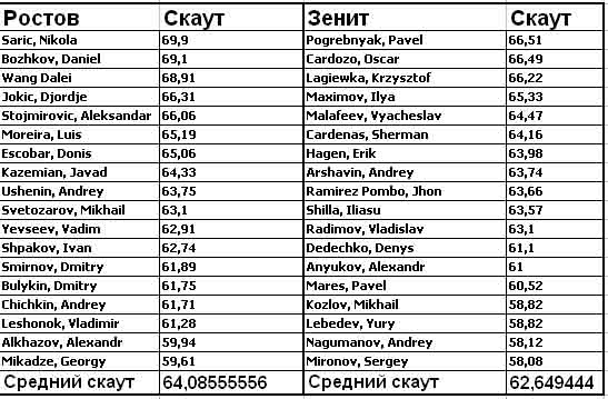 вот для примера скауты команд из одной нормативной группы - Ростова и Зенита. Тут очевидно, что Ростов сильнее по составу.
