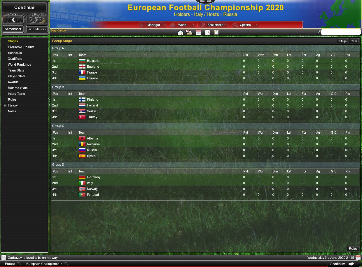 Начну по-порядку, то есть со сборной, что она делала целый год в товах перед чемпионатом Европы. Южная Корея 5-1. Голы - Чудо, Зедов-2, ОНчег и Биля. МОМ- Пафнутий. Хорватия 2-2. Дубль Зедов, он же МОМ. Если так пойдёт - Зедов успеет меня по голам в сборной обогнать. Гонконг - 10-0! Дубли - ОНчег, Чудо, Медведев, по голу - Максимов, Калинин, Вхиллес, Зедов. Больше всех ассистов у Пафнутия - 3. МОМ - Медведев. И последний контрольный матч с Испанией. 0-2. Как посильнее соперник - и пизда сразу. Правда, нужно отдать должное - у наших весь матч было подавляющее преимущество. На ЧЕ мы попали в группу Албания, Испания, Румыния. Честно говоря, я вообще в шоке, что тут есть Албания. |