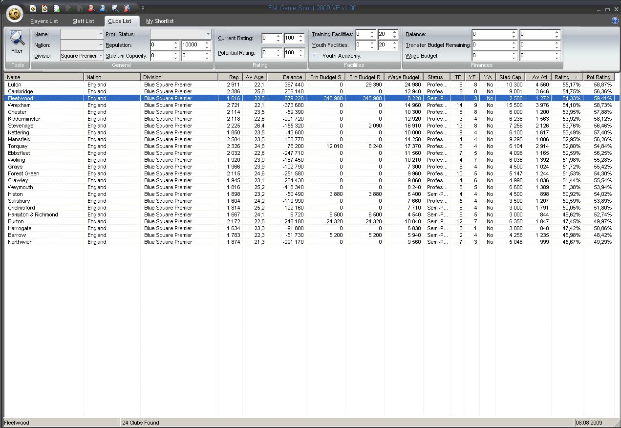 Правила игры: 1. Скаут юзаю на полную (вручную ищу не хуже, но время экономится) 2. Матчи переигрываю, если считаю для себя нужным (ну мне просто нах не надо, если ведущего на полгода уебали). В общем, игра должна приносить радость и удовольствие. 3. В остальном фэйр плей. Клуб Флитвуд Таун - стадио один из самых маленьких в конфе - 2500, из них только 500 сидячих. Задача в первый сезон была место занять в середине Лиги Blue Square North. Основные игроки клуба со скаут рейтингом около 40. Денег в клубе ноль. И их не предвидется, потому как приток с продаж невозможен - самые дорогие игроки стоят 2-3 тысячи, а в месяц убытков 15-20 тысяч. Только одна надежда - зарабатывать в кубках. В первый сезон набрал на старте с фри чел 20, почти всех старых выгнал тупо - бабок и так нет, минус сто тысяч погоды не делает, зато фонд зарплаты выправил. Лидеры лиги имеют состав - у основных игроков скутрейтинг около 50 и чуть выше. Я на этот уровень вышел только к зиме - хороших футболистов собирал по крохам. Зато после нового года сколотил таки состав, вышел на первое место в лиге весной и уже его никому не отдал, финишировав с отрывом около 10 очков. |