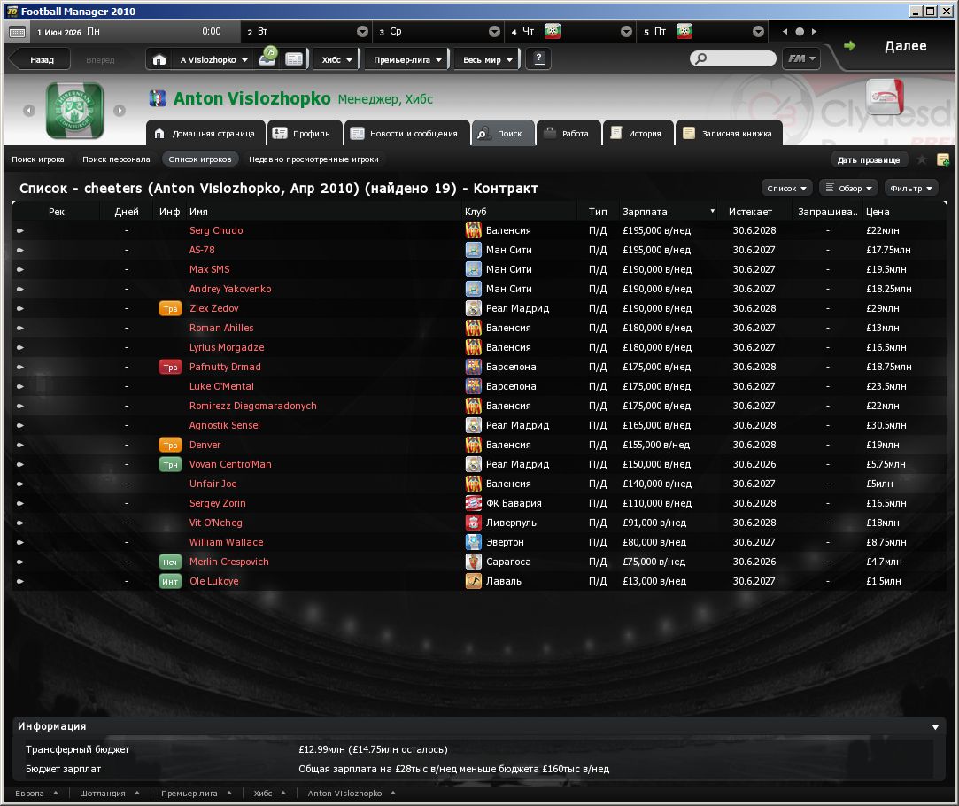 В кубке УЕФА (лига Европы) набравший силу Ливерпуль всех сметал на своём пути до самого финала. В финале обыграли Кальяри (дубль ОНчег), что в общем-то было бы удивительно, если было по другому. Лига Чемпионов. В одну восьмую дружно вышли все наши клубы - Реал, Валенсия, Барселона, МанСити, Эвертон, Бавария, Сарагоса. вобщем все. но есть одно но. Барселона с какогото хуя (пардон за мой французский) заняла в группе второе место(уступила Бирмингему), и поэтому в 1/8 была среди несеянных команд. Ну и имела несчастье попасть на Баварию. Все остальные же вышли в весну с первого места, и получили лёгких соперников. Ну и в то время, как все наши клубы прохлаждались, Баварию и Барсу ждала жескарёвая заруба. В первом матче Бавария, на выезде выиграла 2-1. А дома была бита по всем статьям 4-1. И всё бы ничего, если бы не травма Пафнутия (перелом бедренной кости). Посмотрим, что будет дальше. Кстати, прохлаждались не все - Сарагоса проиграла Спортингу 1-0 и 0-2, Мерлин особо не выручил. Четвертьфинал: Реал-Валенсия Барса-Спортинг МЮ-МанСити Эвертон-Бирмингем Реальные такие пары, я бы сказал, слепой жребий такой слепой (как это нынче модно). МЮ-Мансити 0-1 и 1-1, усилиями не наших киборгов горожане идут дальше. Эвертон-Бирмингем. 5-1 (дубль Воллоса), и ответные 0-2 уже не имели никакого занчения. Барса-Спортинг 2-0 и 3-1, Барса идёт дальше, ну с таким можно справиться и без Пафнутия. Реал-Валенсия. 1-0 первыфй матч, Денвера удалили на 12 минуте. Ответный матч 1-0, Чудо забил фееричный гол на первой минуте, и в итоге всё решилось в серии пенальти. В полуфинал вышел Реал. Полуфиналы МанСити-Эвертон Реал-Барселона МанСити-Эвертон первый матч 1-0 (ЛаМанна), второй 0-0, в финал вышел МанСити. Барса-Реал первый матч дома выиграл Реал 1-0. В ответке Зедов забил гол, а ОМентал на 72 минуте был удалён, в общем 2 раза по 1-0, в финал прошёл Реал. Финал. МанСити-Реал. Тут случилось несчастье. Зедов получил микротравму, и в финале принять участие не смог. В итоге МанСити устроили форменное издевательство. 5-0. и это в ворота Агностика! Отличились ЛаМанна, Яковенко, СМС. Плюшки ЛЧ и Европы. Лучший бомбардир ЛЧ - Нобре и ЛАМанна (оба из Мансити) по 15 мячей. Лучший игрок ЛЧ - АС-78.Второй - ЛАМанна. В дримТим ЛЧ попали аж 9 игроков МанСити (СМС, АС и Яковенко там тоже есть), и только двое -Агностик и ещё один чувак из Спортинга. Голкипер года в Европе - Агностик. четвёртый год подряд, в чём сравнялся с таким зубрами, как Лев Яшин и Касильяс. Второй вратарь из Баварии, третий - из МанСити. Защитник года - чувак из Наполи. Полузащитник года - впервые Зорин, второй Пафнутий, третий ОНчег. Нападающий года - Зедов. Золотая бутса - тоже Зедов. Лучший игрок Европы - Зорин (впервые). Зедов второй, Пафнутий третий. Мировые плюшки. Футболист года - Зедов (второй год подряд), Пафнутий второй, Зорин третий. Игрок года - Зедов (тоже второй год подряд), Пафнутий второй, ОМентал третий. Скрин ДримТим мира прилагается. Эскизы прикрепленных изображений |