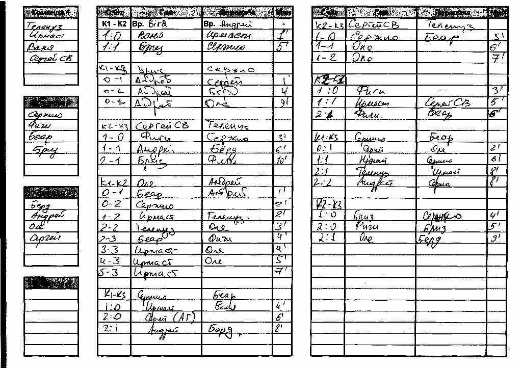 К2 +3=1-2, 11:11, 10 К1 +2=2-2, 11:12, 8 К3 +2=1-3, 10:9, 7 Гол+Пас Ирмаст 7+2 Оле 3+5 Андрей 6+1 Фиги 4+2 Сержио 2+4 Беар 2+3 Бриз 3+1 Бёрд 0+4 Телепуз 2+1 СергейС 1+2 Иван 1+1 СергейСВ 0+1 Турнир получился очень ровным, борьба шла до последних минут последнего матча. Даже количество забитых у всех команд почти одинаково. Если бы К2 сыграла последний матч вничью до 2:2, то она заняла бы 3-е место, а так - We are the champions, my friend! |