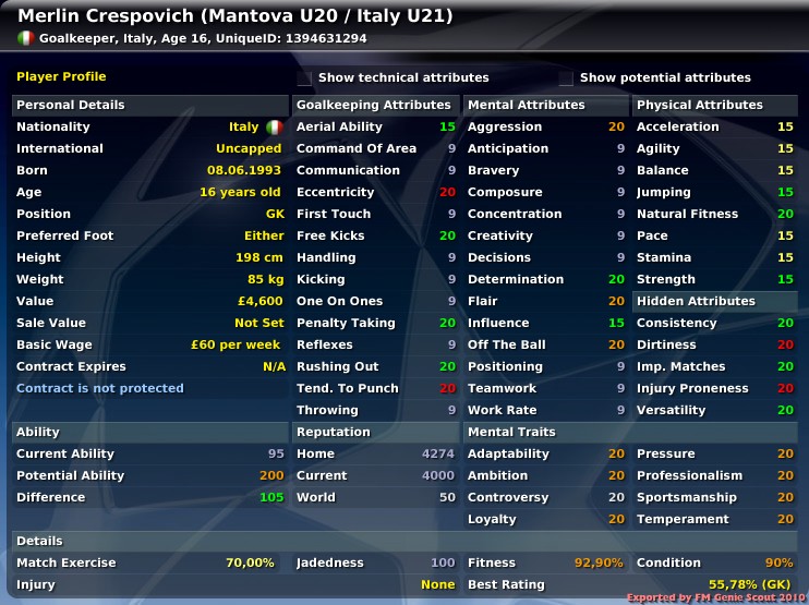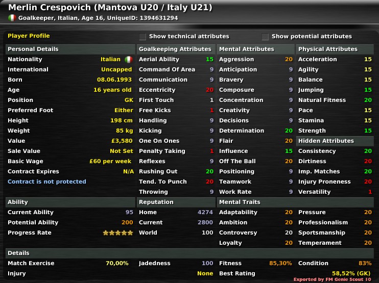 А теперь я предлагаю вам открыть одновременно оба этих скрина и поизучать цифирки на одинаковых аттрибутах. Для тех, кто подойдёт к этому тщательно, а также тщательно прочитали предыдущий текст, вопрос с генерацией читеров в ФМе будет закрыт. Для тех, кто не очень тщательно - чуть попозже я подброшу ещё немного инфы и даже сделаю выводы